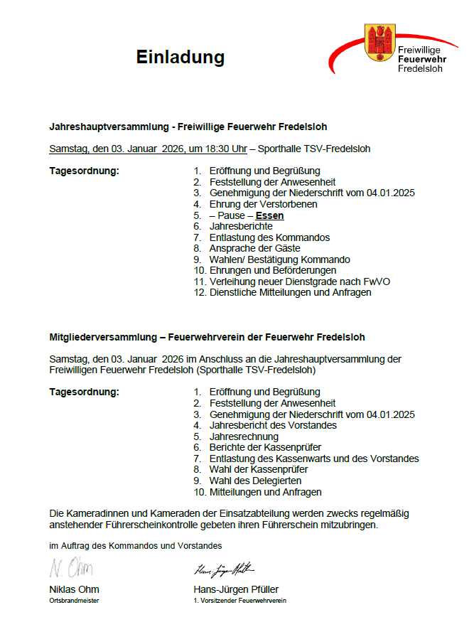 Hiermit laden wir alle Mitglieder der Freiwilligen Feuerwehr Fredelsloh sowie des Feuerwehrverein Fredelsloh e.V. herzlich zur Jahreshauptversammlung ein!